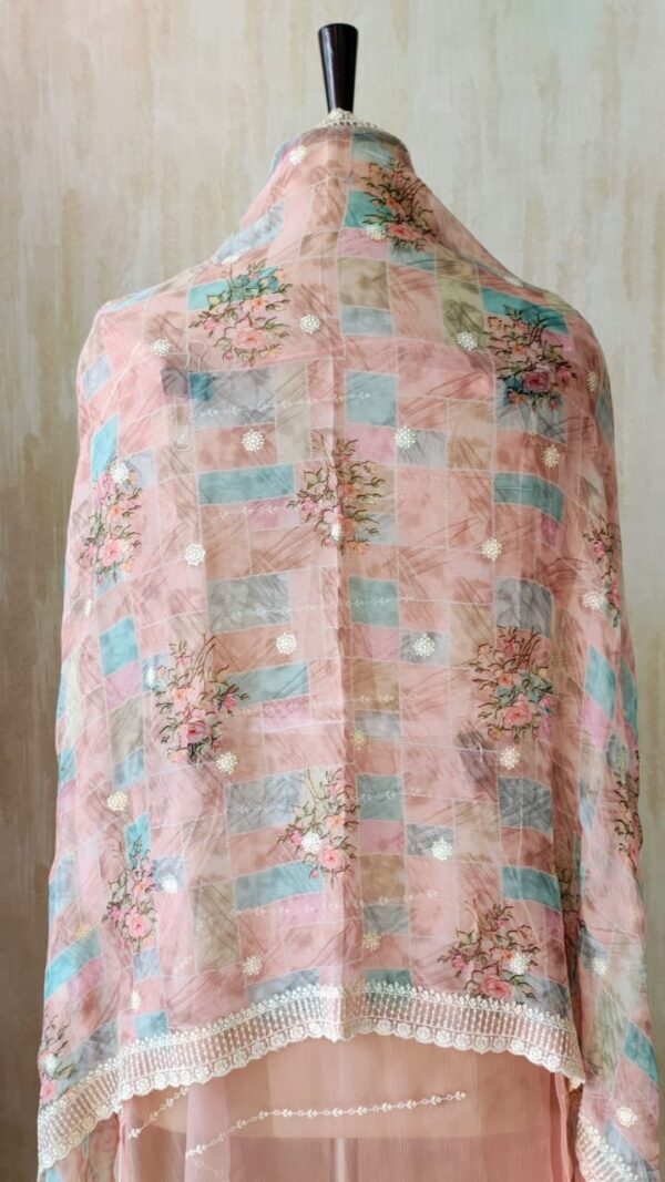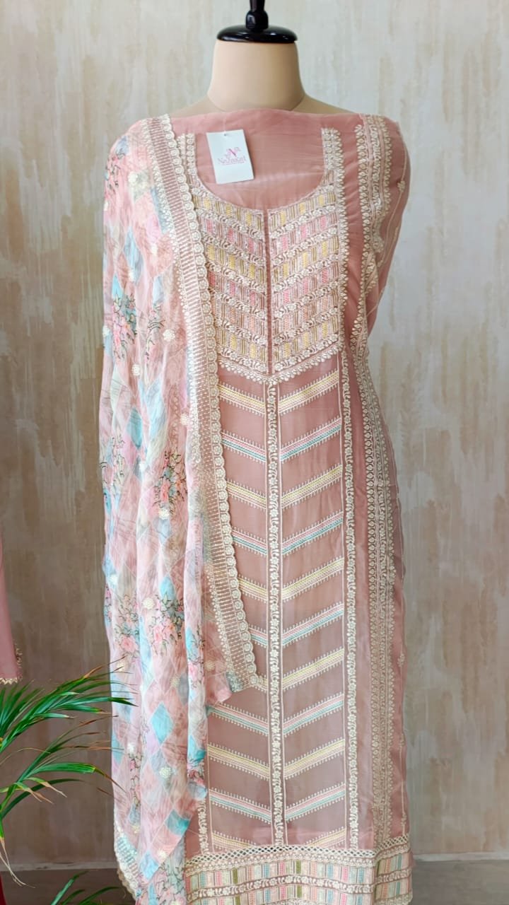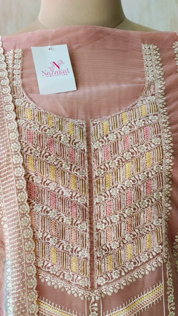 This is a pastel pink embroiderd suit with delicate thread work and nalki work on all over suit