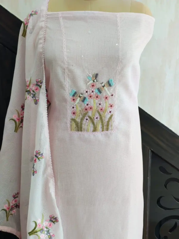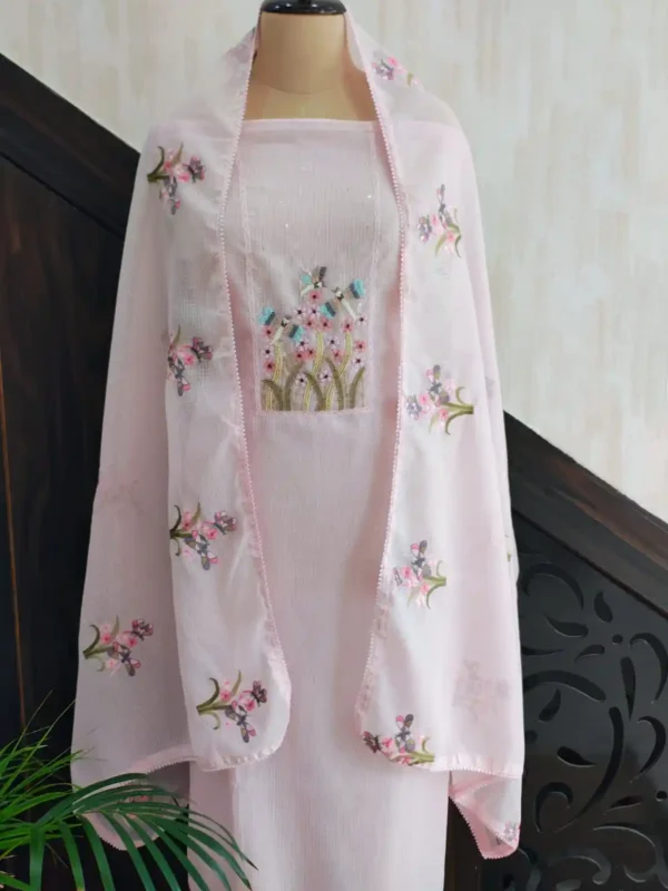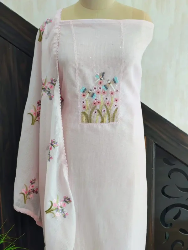 This is stunning pastel colour kota doria shirt fabric with beautiful neckline with colourful pearl detailing..