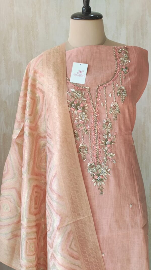 Graceful linen shirt fabric with beautiful handwork detailing on neckline and sequence motif on all over border