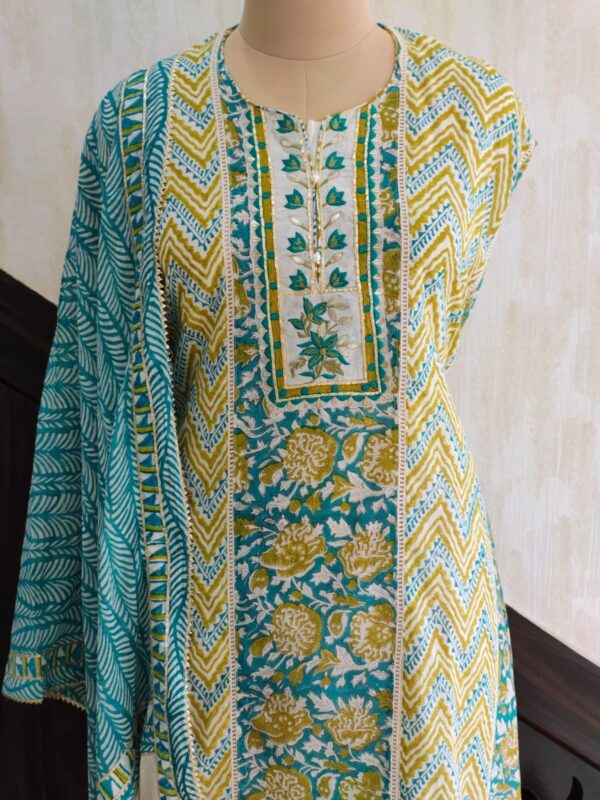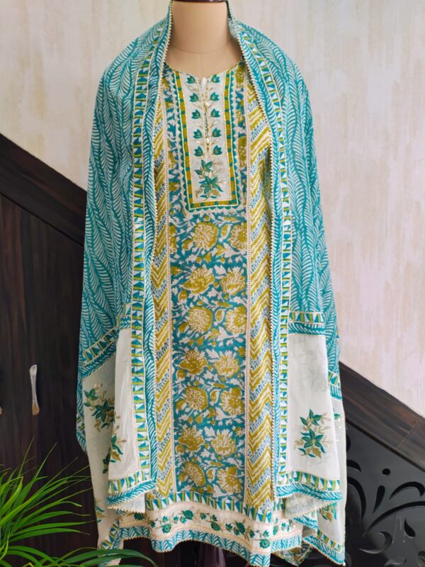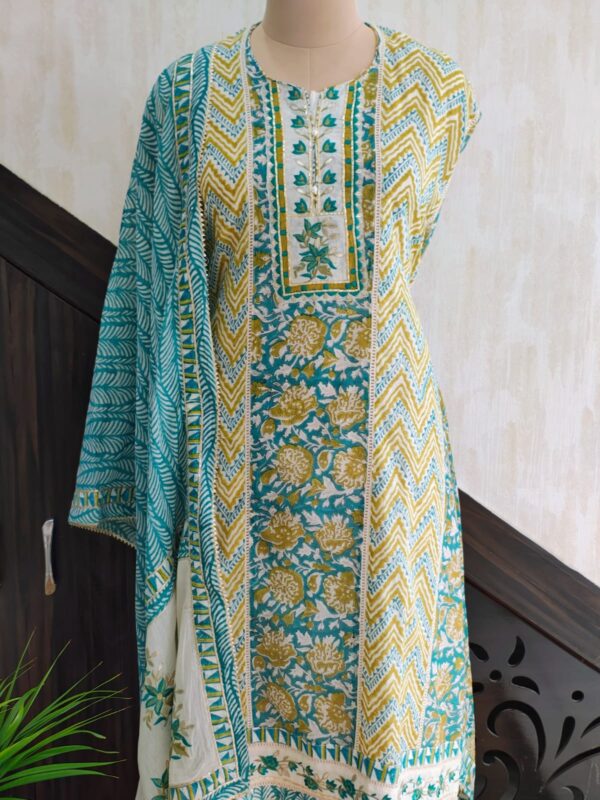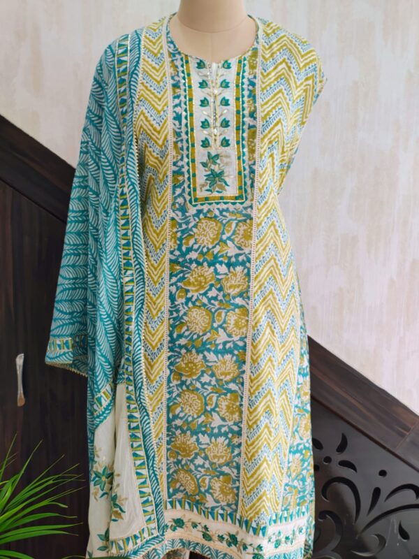Shirt fabric mul chanderi with gotta kinari lace with leather patch work on neckline