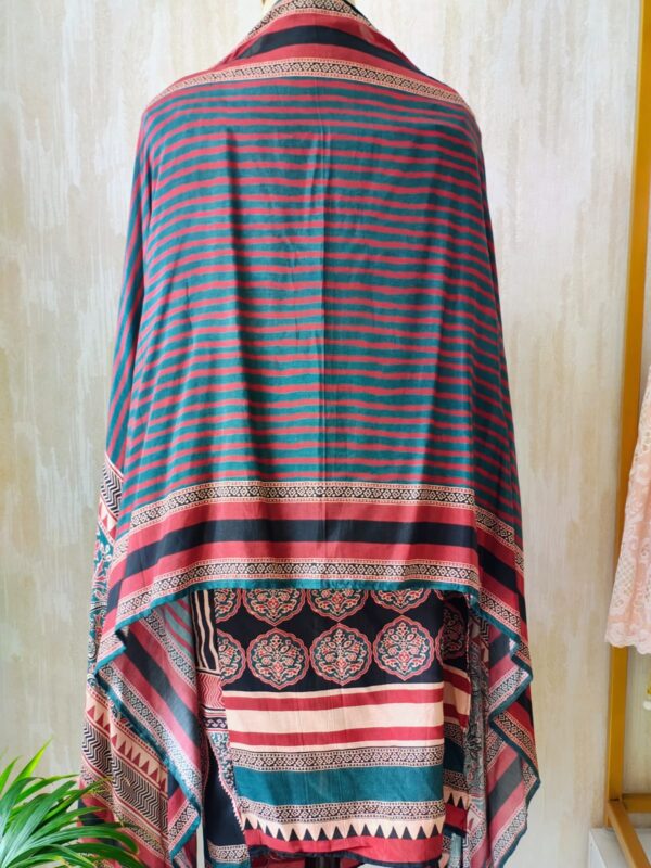 Soft muslin Ajrak printed dupatta with tassels attached on the four sides.